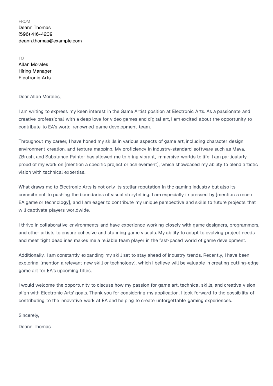 I would welcome the opportunity to discuss how my passion for game art, technical skills, and creative vision align with Electronic Arts' goals. Thank you for considering my application. I look forward to the possibility of contributing to the innovative work at EA and helping to create unforgettable gaming experiences.