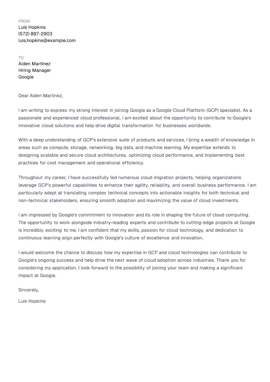 Finally, express your enthusiasm for the opportunity to contribute to the company's success using GCP. Your passion for cloud technology and the specific role should be evident throughout the letter body.