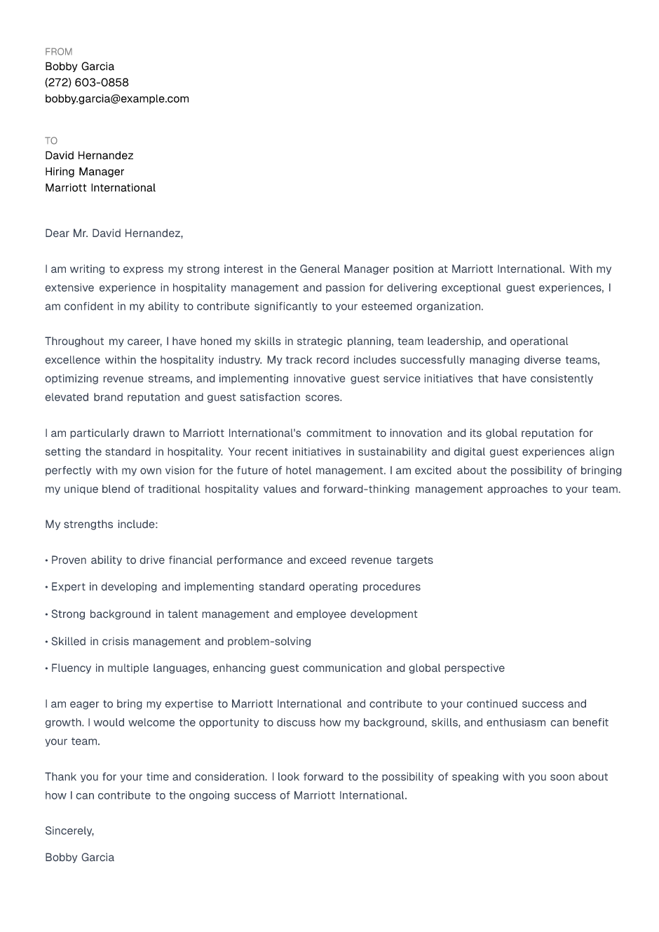 I am writing to express my strong interest in the General Manager position at Marriott International. With my extensive experience in hospitality management and passion for delivering exceptional guest experiences, I am confident in my ability to contribute significantly to your esteemed organization.