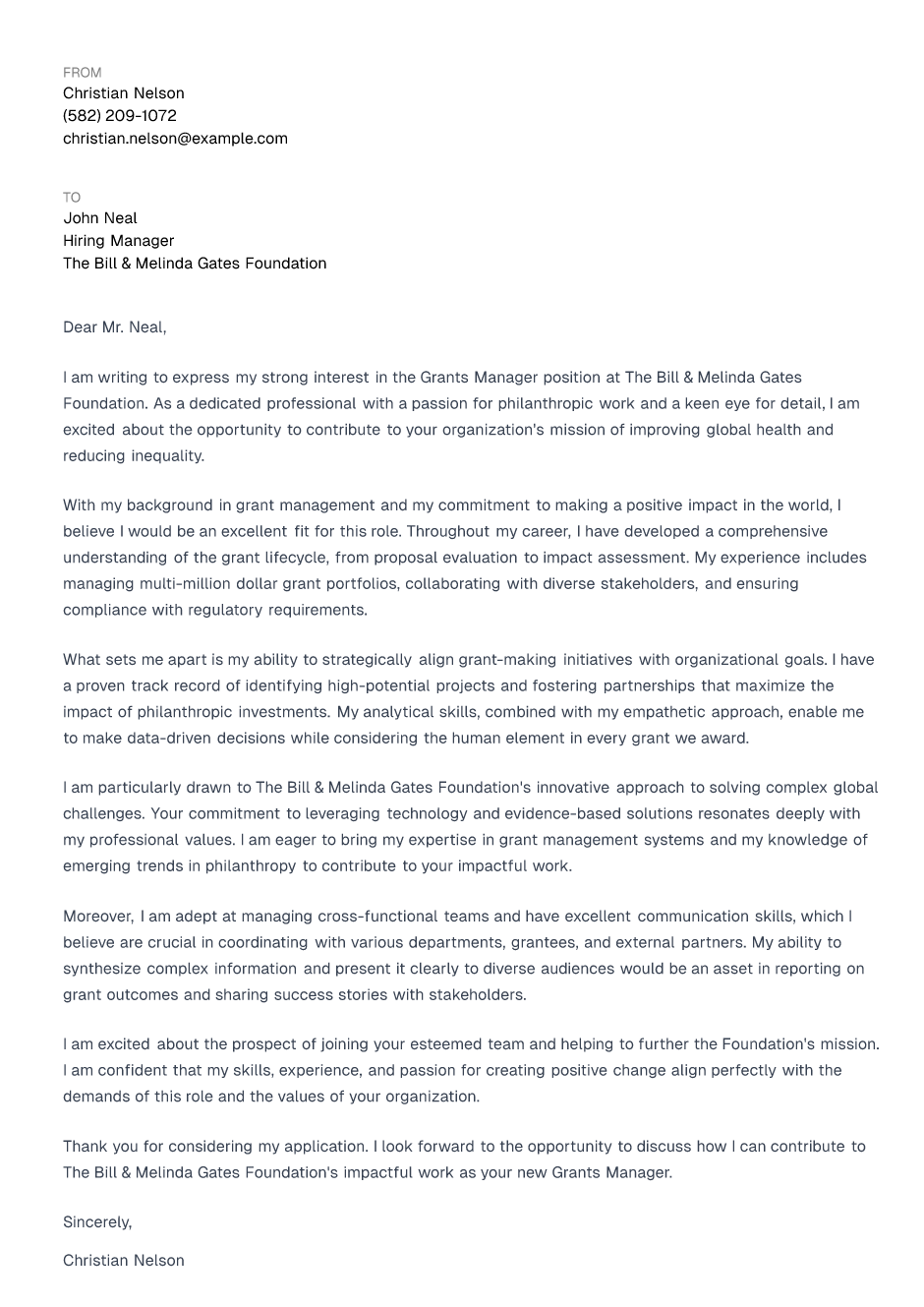 Thank you for considering my application. I look forward to the opportunity to discuss how I can contribute to The Bill & Melinda Gates Foundation's impactful work as your new Grants Manager.