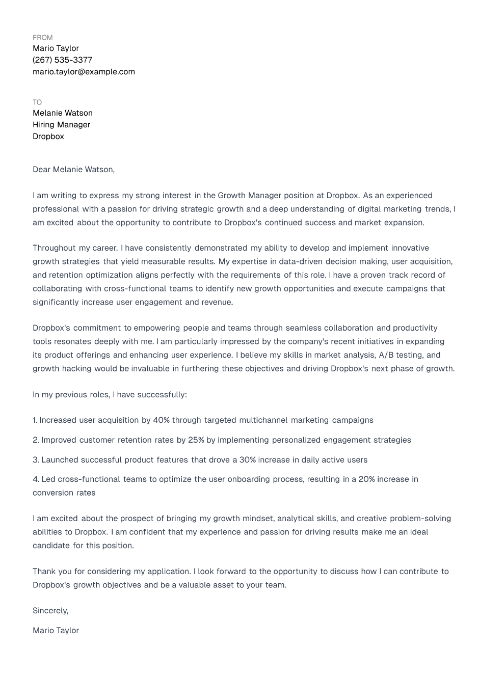 Growth Manager Cover Letter Example