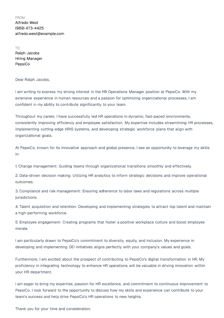 Remember to keep the body concise and focused, typically no more than three to four paragraphs. Each paragraph should serve a specific purpose in building your case as the ideal candidate for the HR Operations Manager position.