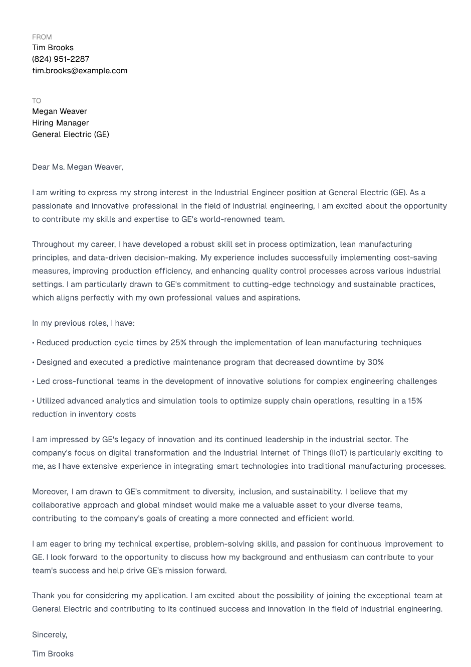 Thank you for considering my application. I am excited about the possibility of joining the exceptional team at General Electric and contributing to its continued success and innovation in the field of industrial engineering.