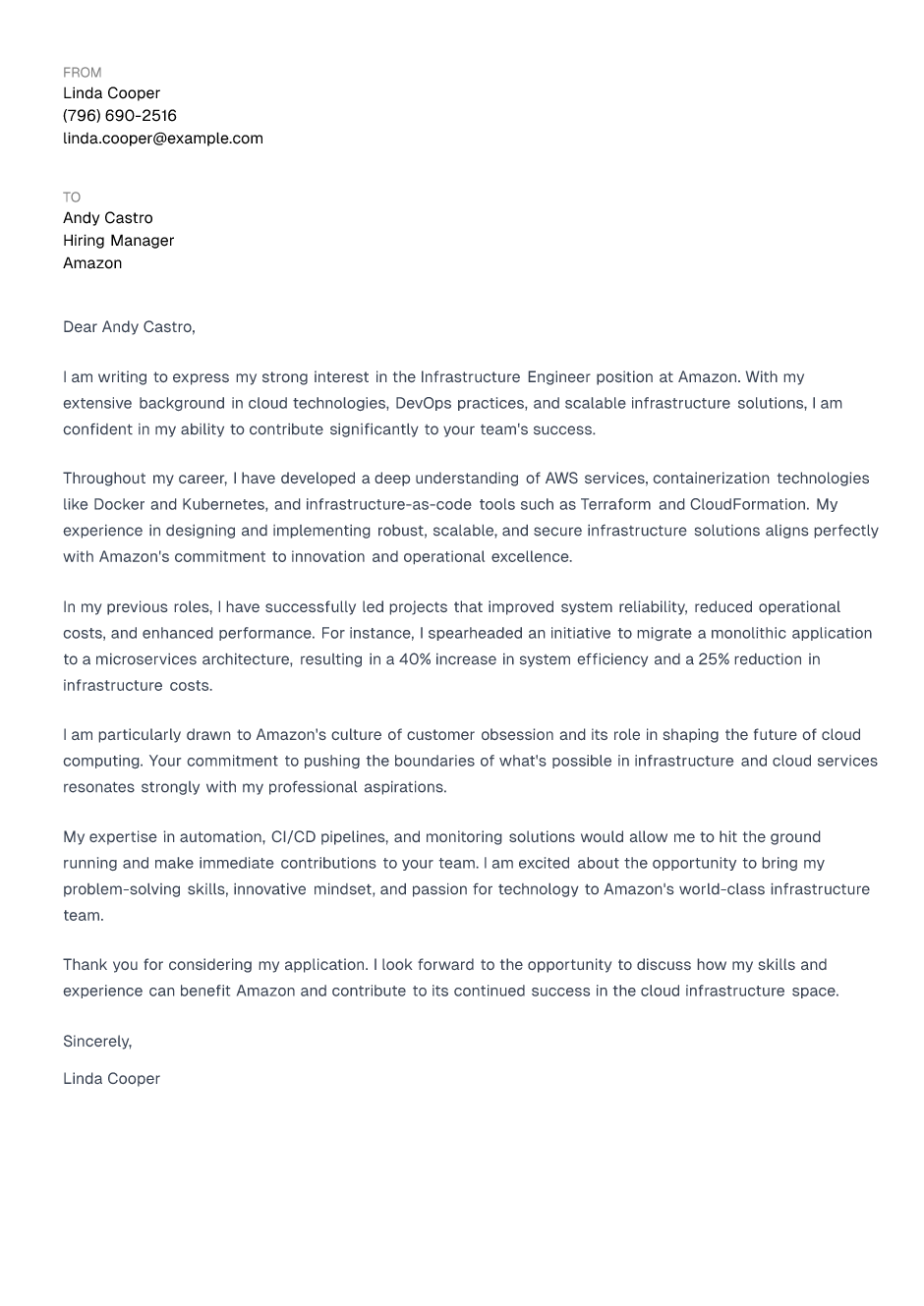 Infrastructure Engineer Cover Letter Example
