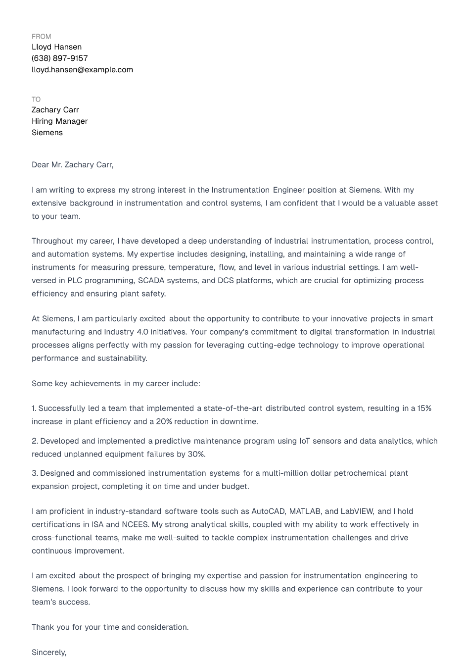 This is a strong example of a cover letter body for an Instrumentation Engineer position for several reasons. First, it immediately establishes the candidate's relevant experience and expertise in the field. The opening sentence clearly states the years of experience and the industries they've worked in, which are directly relevant to the position.
