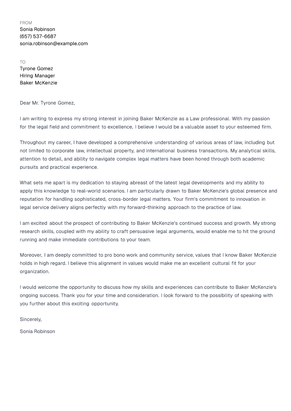 I am writing to express my strong interest in joining Baker McKenzie as a Law professional. With my passion for the legal field and commitment to excellence, I believe I would be a valuable asset to your esteemed firm.