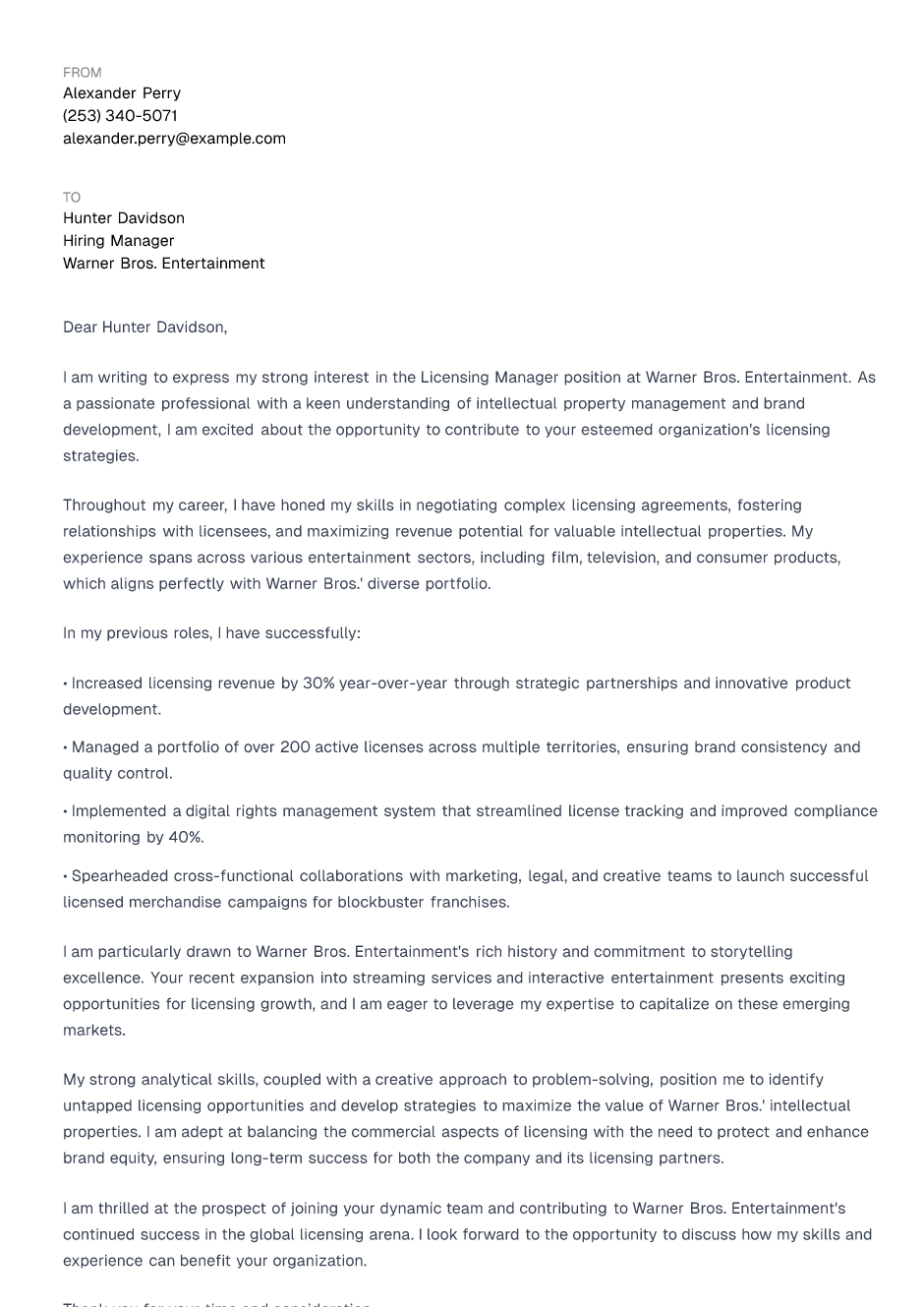 I am thrilled at the prospect of joining your dynamic team and contributing to Warner Bros. Entertainment's continued success in the global licensing arena. I look forward to the opportunity to discuss how my skills and experience can benefit your organization.
