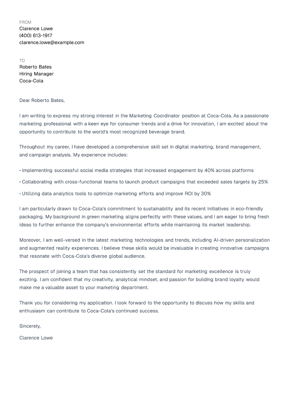 Thank you for considering my application. I look forward to the opportunity to discuss how my skills and enthusiasm can contribute to Coca-Cola's continued success.