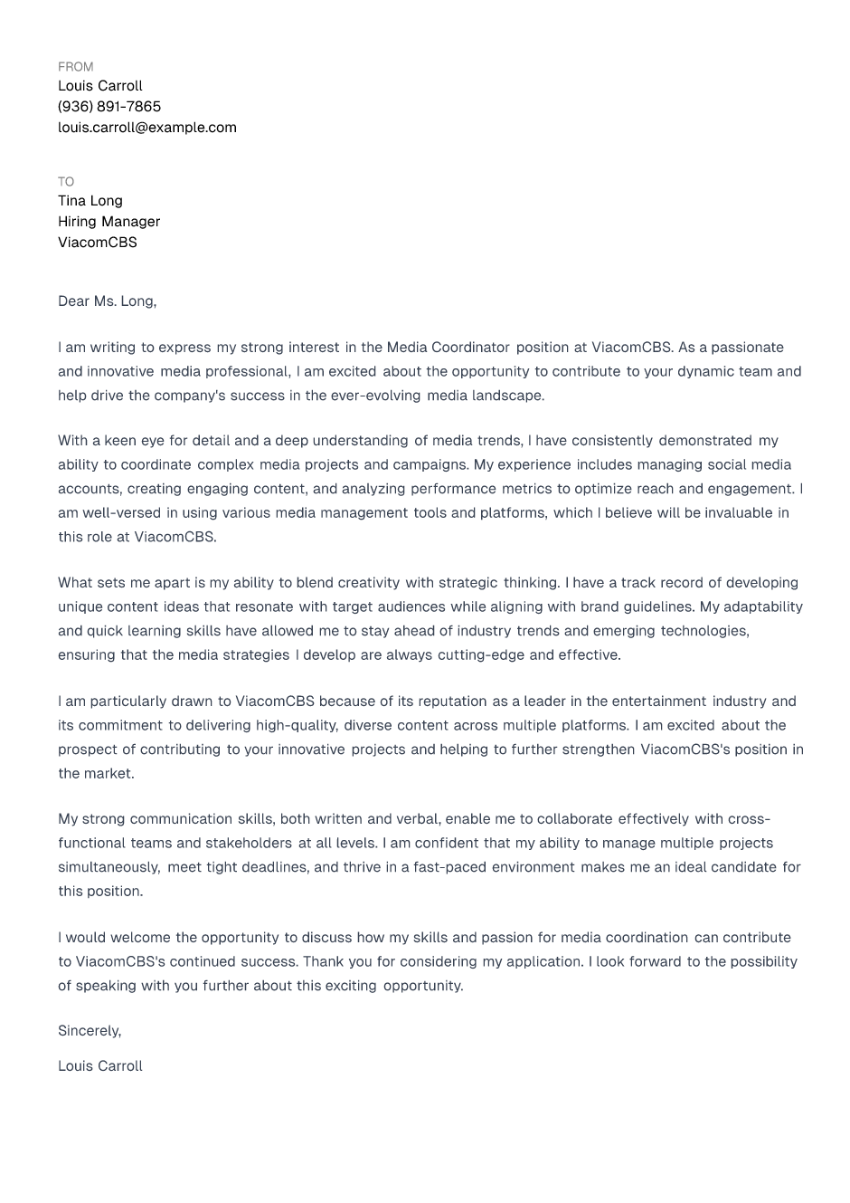 I would welcome the opportunity to discuss how my skills and passion for media coordination can contribute to ViacomCBS's continued success. Thank you for considering my application. I look forward to the possibility of speaking with you further about this exciting opportunity.