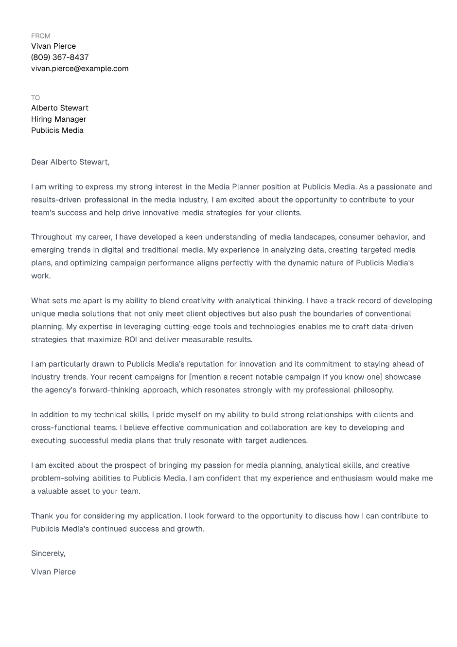 Your cover letter should explain why you want to be a media planner and what skills you have that make you good for the job. It's also a chance to show that you understand what the company does and how you can help them.