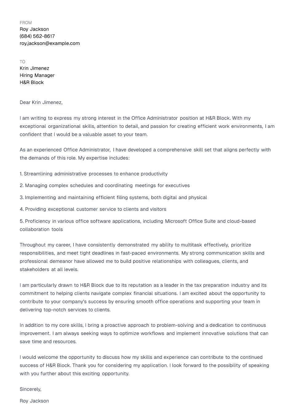 I am writing to express my strong interest in the Office Administrator position at H&R Block. With my exceptional organizational skills, attention to detail, and passion for creating efficient work environments, I am confident that I would be a valuable asset to your team.
