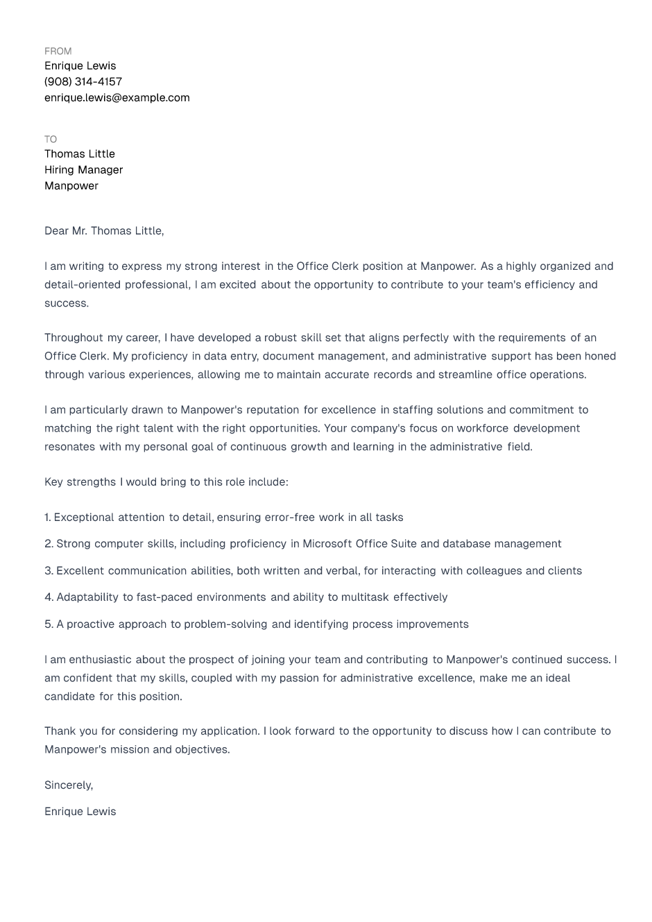 I am writing to express my strong interest in the Office Clerk position at Manpower. As a highly organized and detail-oriented professional, I am excited about the opportunity to contribute to your team's efficiency and success.