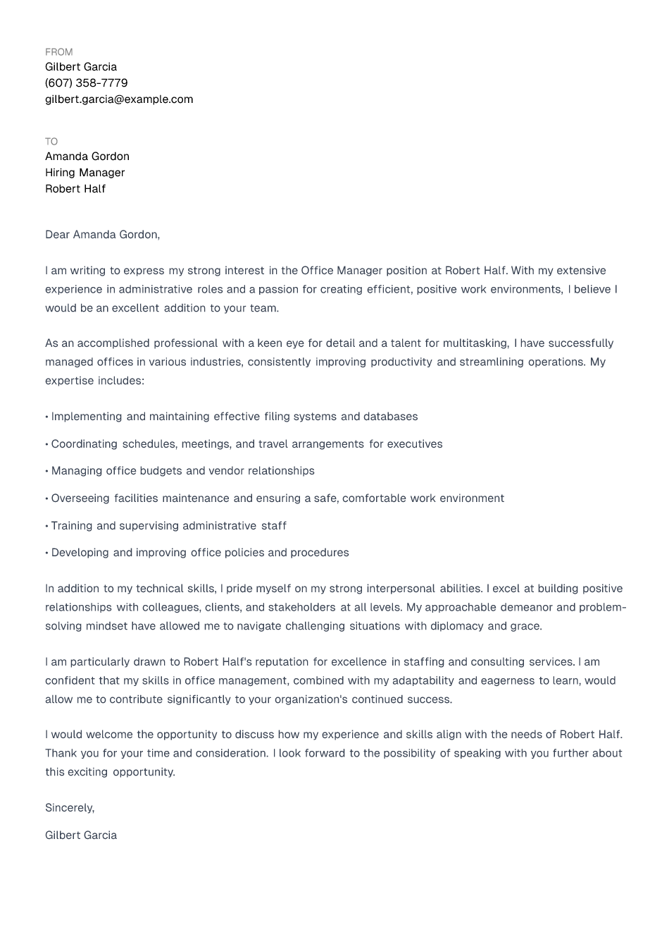 I am writing to express my strong interest in the Office Manager position at Robert Half. With my extensive experience in administrative roles and a passion for creating efficient, positive work environments, I believe I would be an excellent addition to your team.