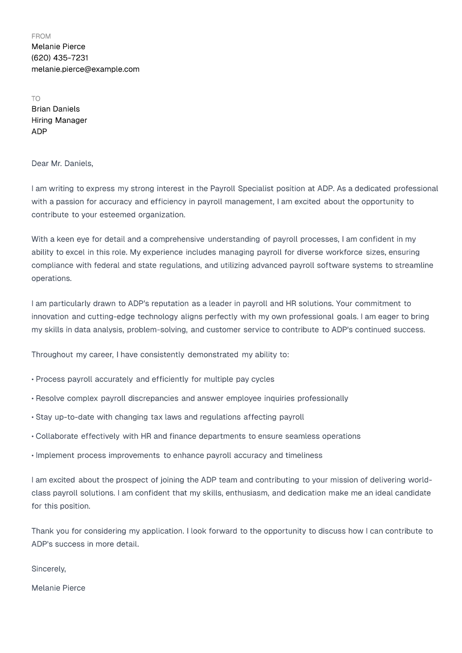 I am excited about the prospect of joining the ADP team and contributing to your mission of delivering world-class payroll solutions. I am confident that my skills, enthusiasm, and dedication make me an ideal candidate for this position.