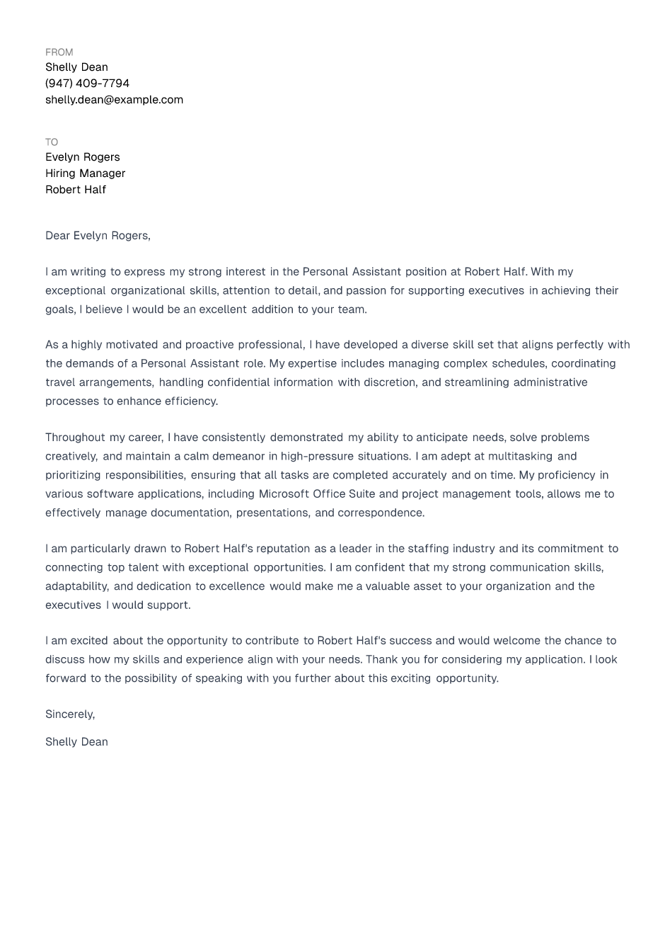 I am writing to express my strong interest in the Personal Assistant position at Robert Half. With my exceptional organizational skills, attention to detail, and passion for supporting executives in achieving their goals, I believe I would be an excellent addition to your team.