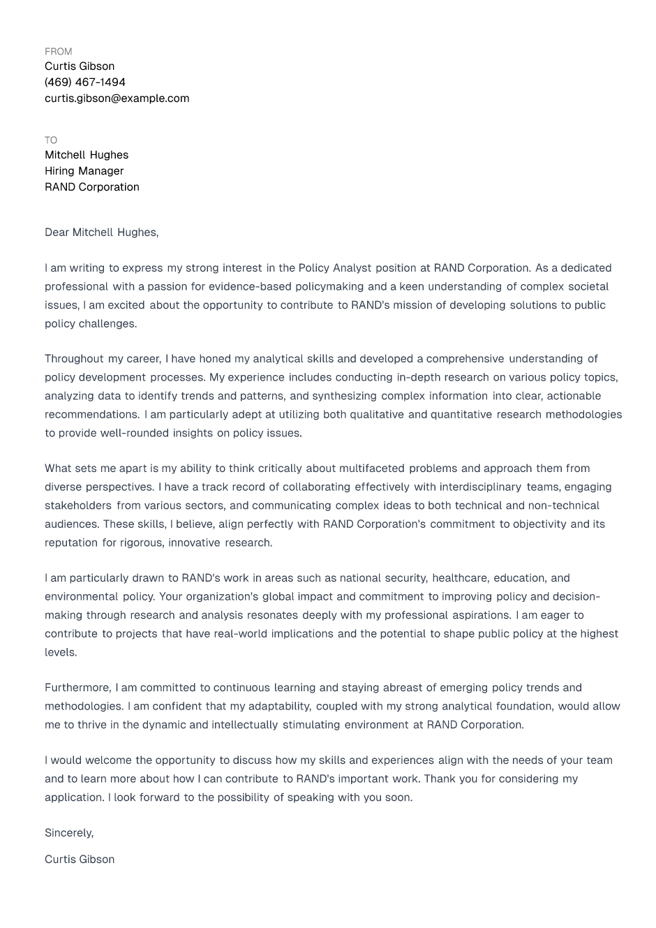 I would welcome the opportunity to discuss how my skills and experiences align with the needs of your team and to learn more about how I can contribute to RAND's important work. Thank you for considering my application. I look forward to the possibility of speaking with you soon.