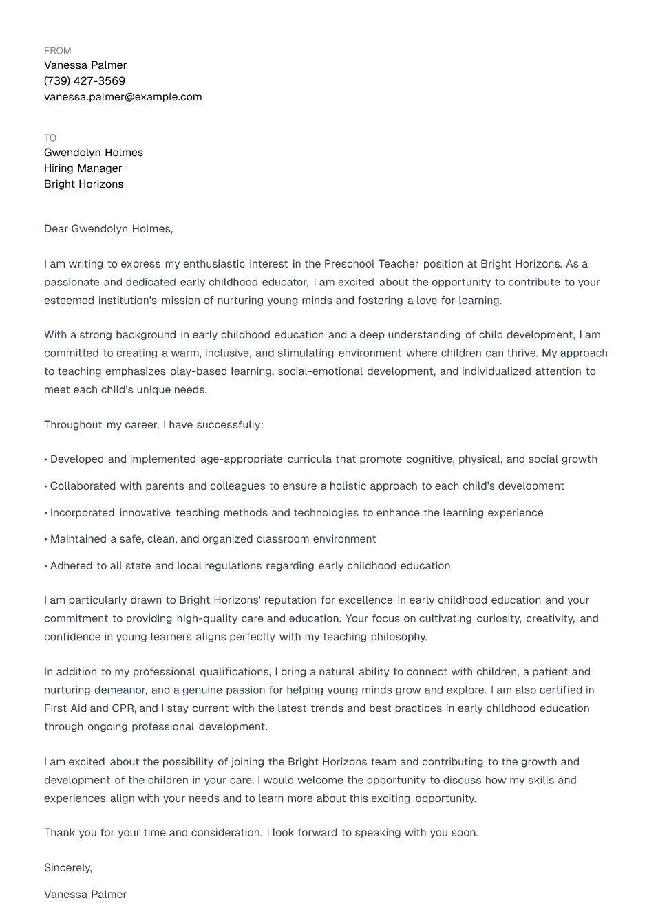 Preschool Teacher Cover Letter Example