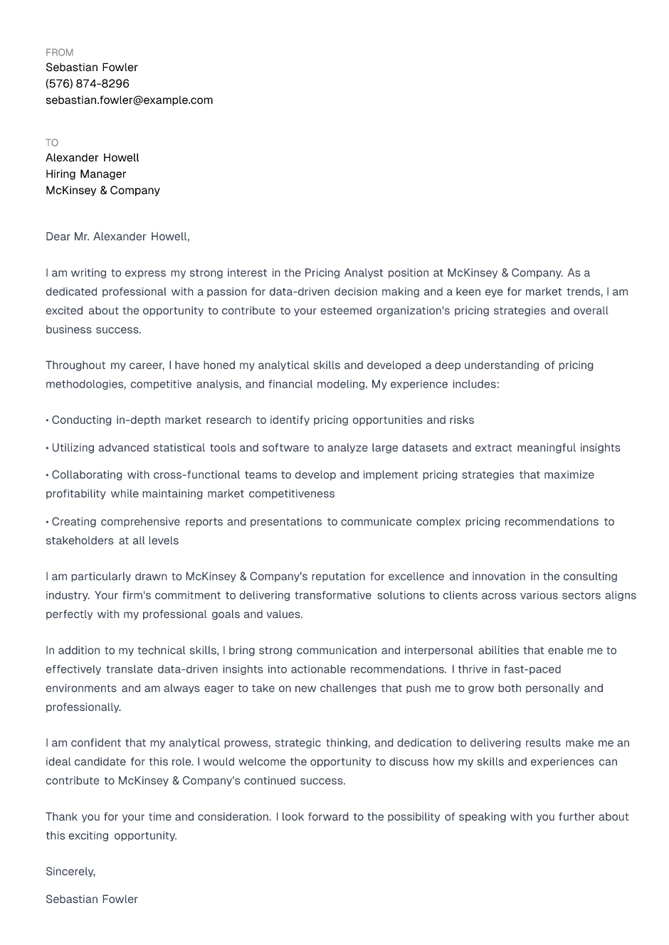 I am writing to express my strong interest in the Pricing Analyst position at McKinsey & Company. As a dedicated professional with a passion for data-driven decision making and a keen eye for market trends, I am excited about the opportunity to contribute to your esteemed organization's pricing strategies and overall business success.