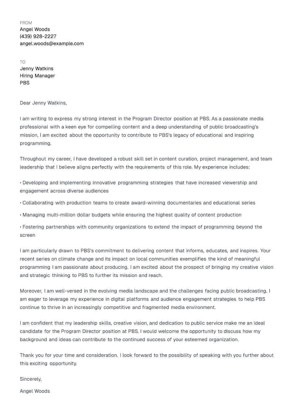 I am confident that my leadership skills, creative vision, and dedication to public service make me an ideal candidate for the Program Director position at PBS. I would welcome the opportunity to discuss how my background and ideas can contribute to the continued success of your esteemed organization.