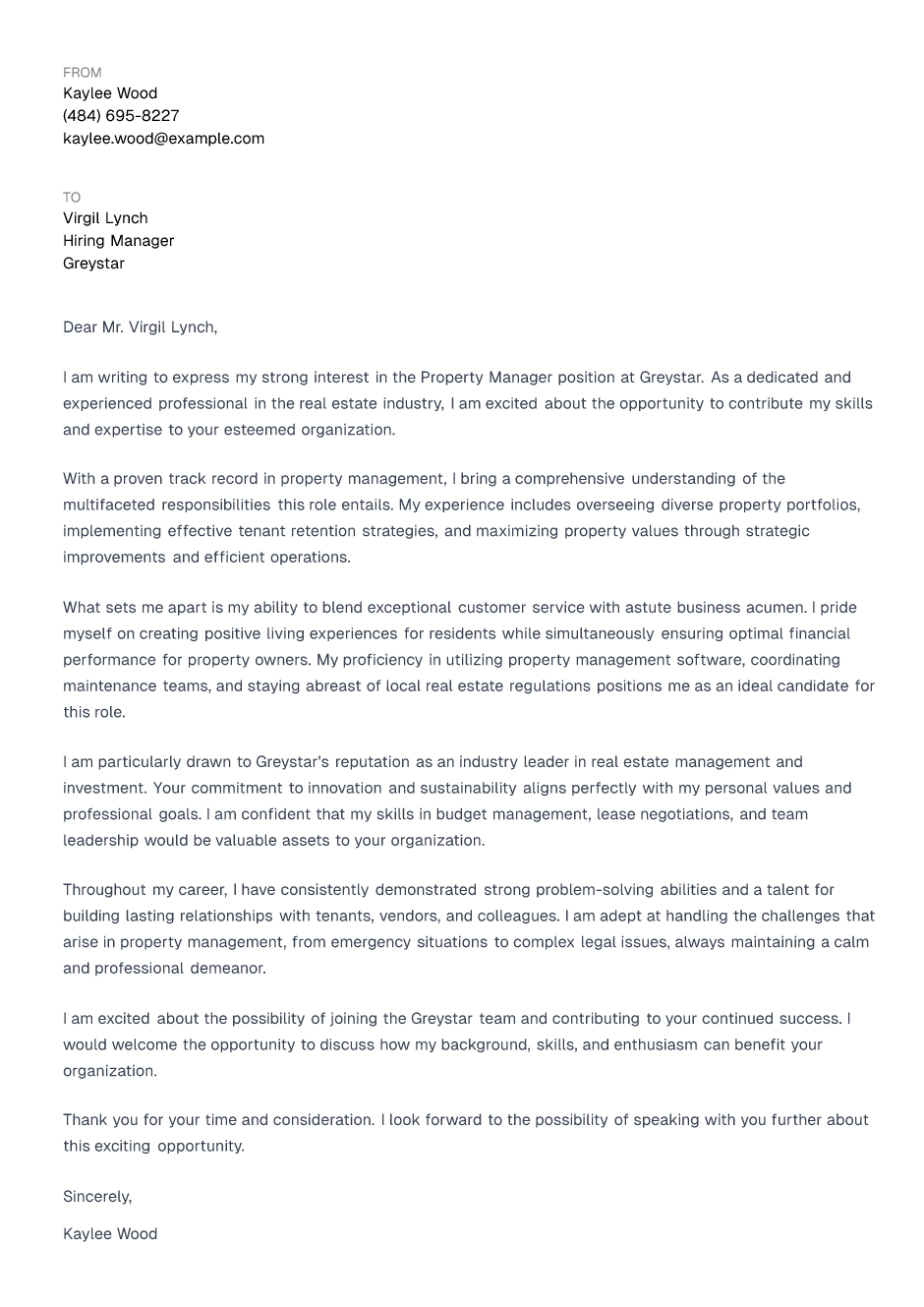 I am particularly drawn to Greystar's reputation as an industry leader in real estate management and investment. Your commitment to innovation and sustainability aligns perfectly with my personal values and professional goals. I am confident that my skills in budget management, lease negotiations, and team leadership would be valuable assets to your organization.