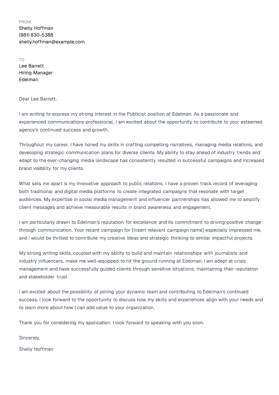 I am writing to express my strong interest in the Publicist position at Edelman. As a passionate and experienced communications professional, I am excited about the opportunity to contribute to your esteemed agency's continued success and growth.