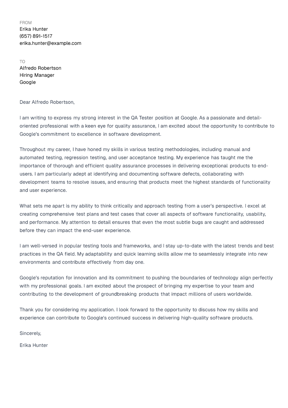 QA Tester Cover Letter Example