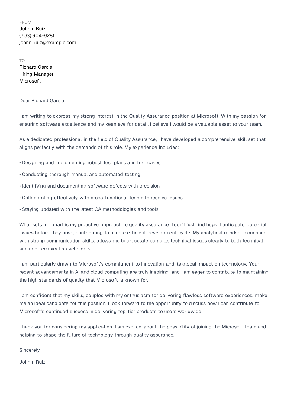 Thank you for considering my application. I am excited about the possibility of joining the Microsoft team and helping to shape the future of technology through quality assurance.