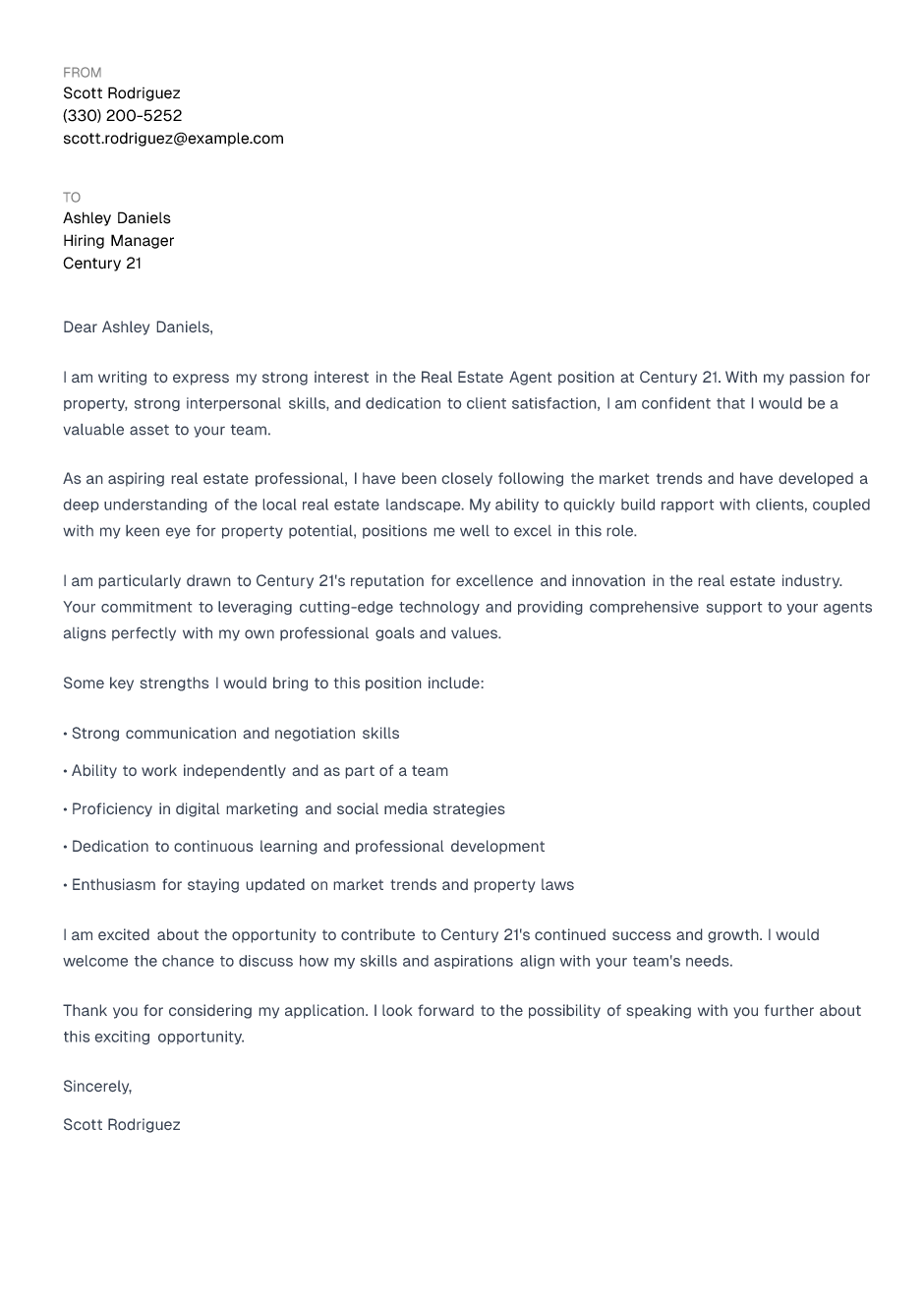 I am writing to express my strong interest in the Real Estate Agent position at Century 21. With my passion for property, strong interpersonal skills, and dedication to client satisfaction, I am confident that I would be a valuable asset to your team.