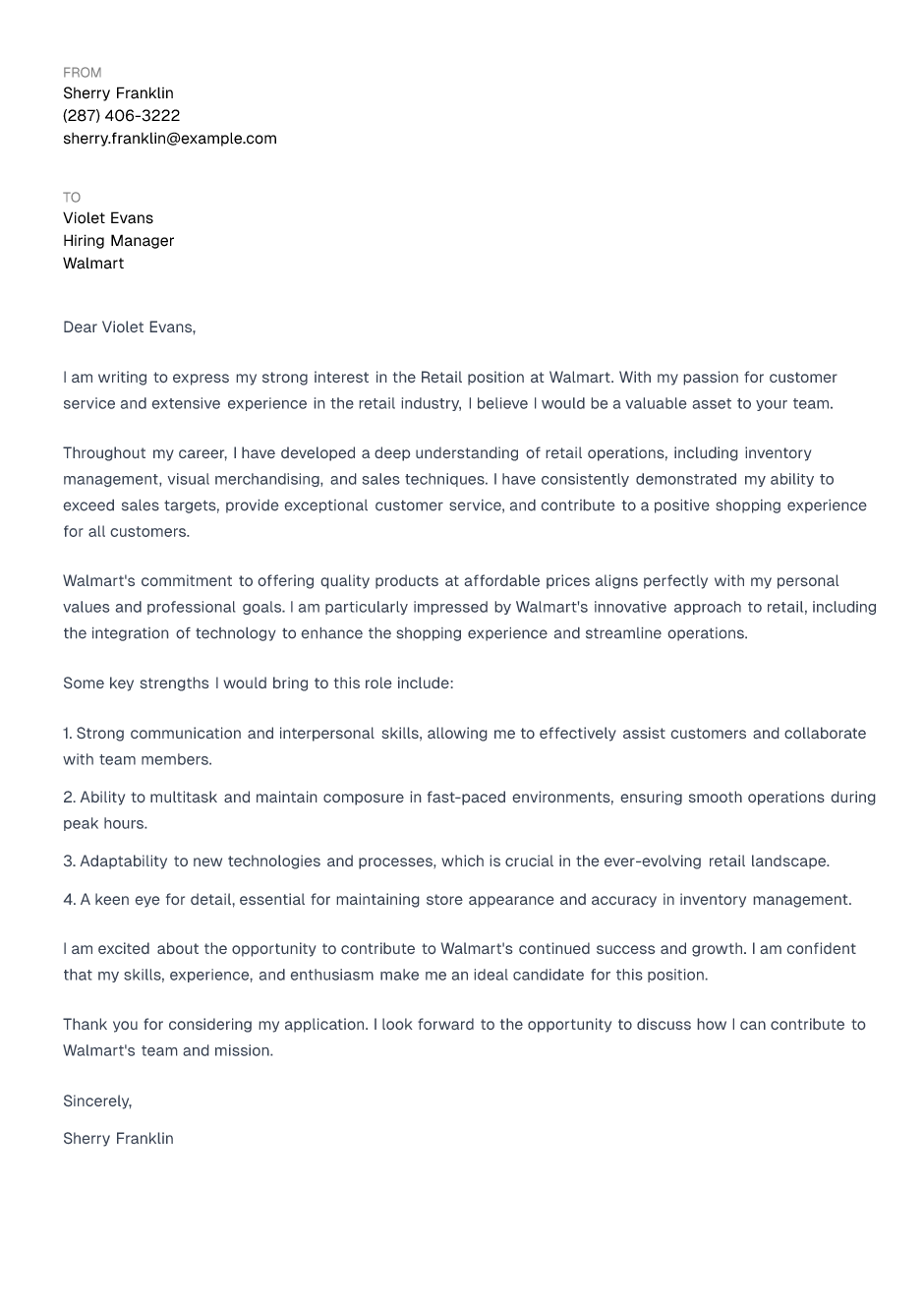 I am excited about the opportunity to contribute to Walmart's continued success and growth. I am confident that my skills, experience, and enthusiasm make me an ideal candidate for this position.