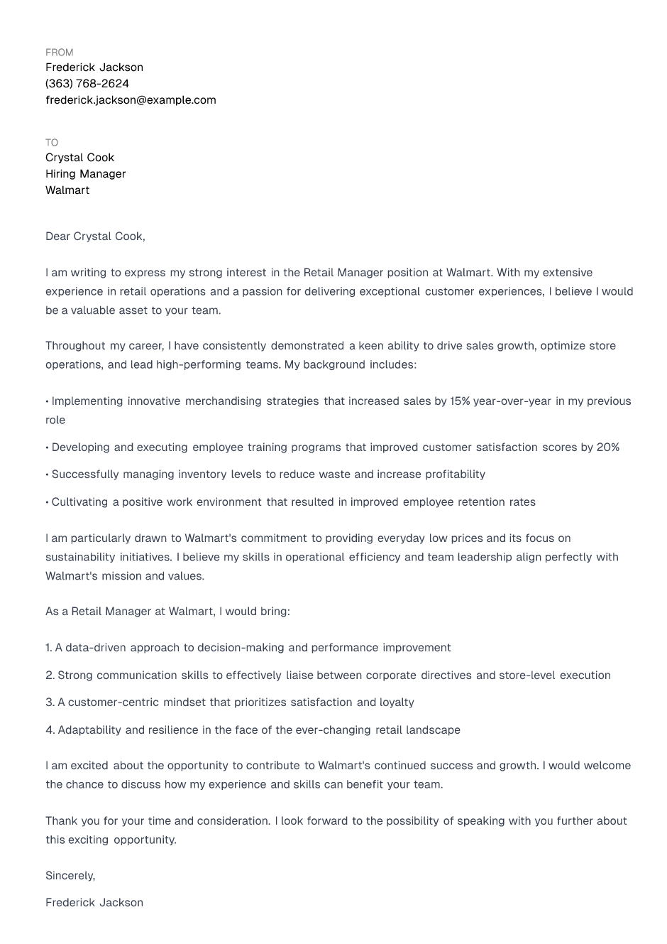 I am excited about the opportunity to contribute to Walmart's continued success and growth. I would welcome the chance to discuss how my experience and skills can benefit your team.
