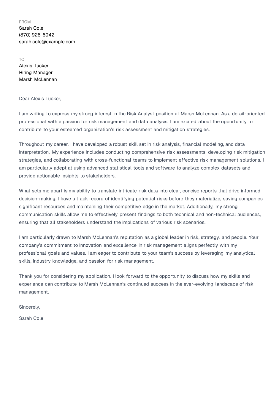 Remember to keep the body concise and focused, typically two to three paragraphs. Each point should reinforce why you are the ideal candidate for the risk analyst position.