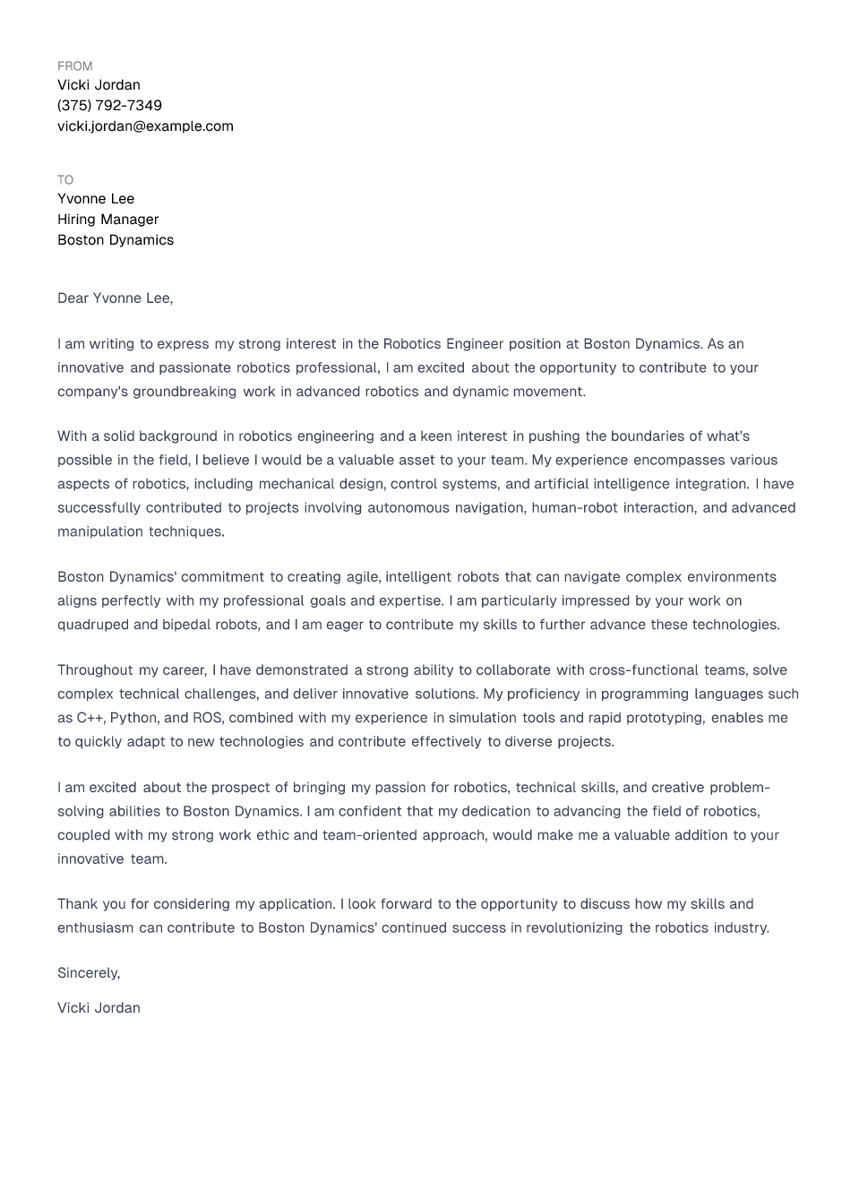 Robotics Engineer Cover Letter Example