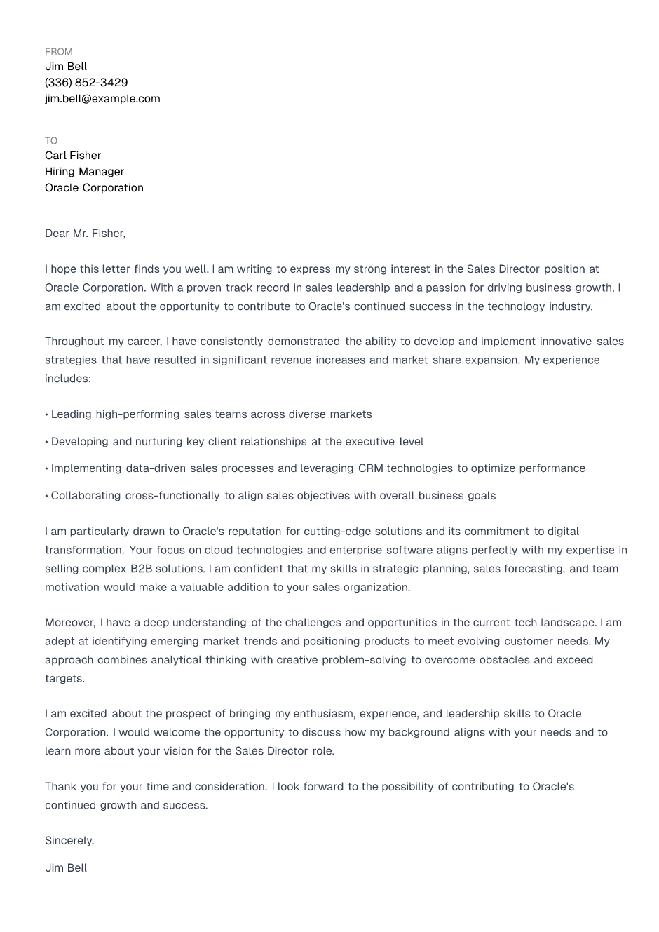 I am excited about the prospect of bringing my enthusiasm, experience, and leadership skills to Oracle Corporation. I would welcome the opportunity to discuss how my background aligns with your needs and to learn more about your vision for the Sales Director role.