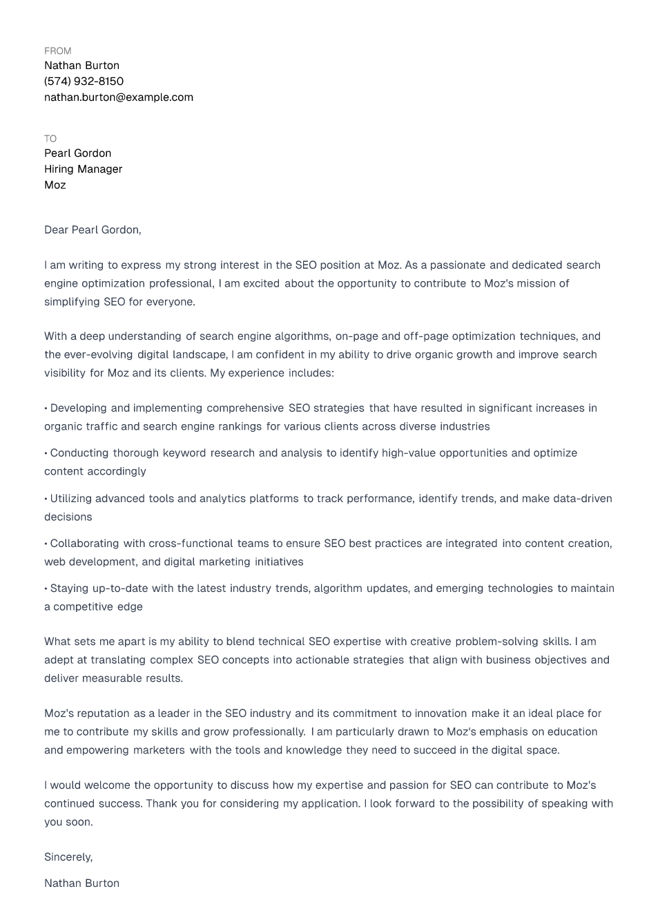 I would welcome the opportunity to discuss how my expertise and passion for SEO can contribute to Moz's continued success. Thank you for considering my application. I look forward to the possibility of speaking with you soon.