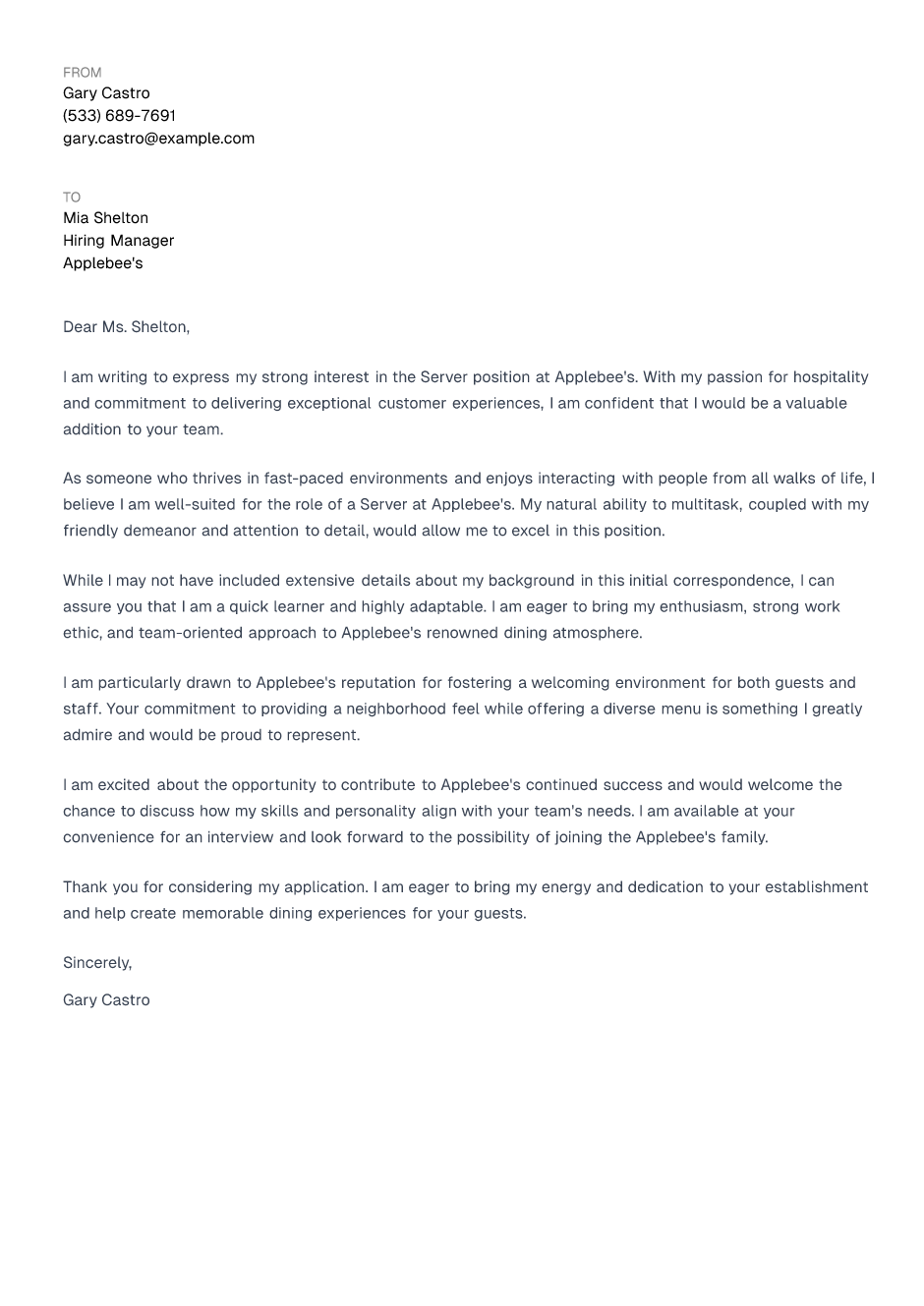 Server Cover Letter Example