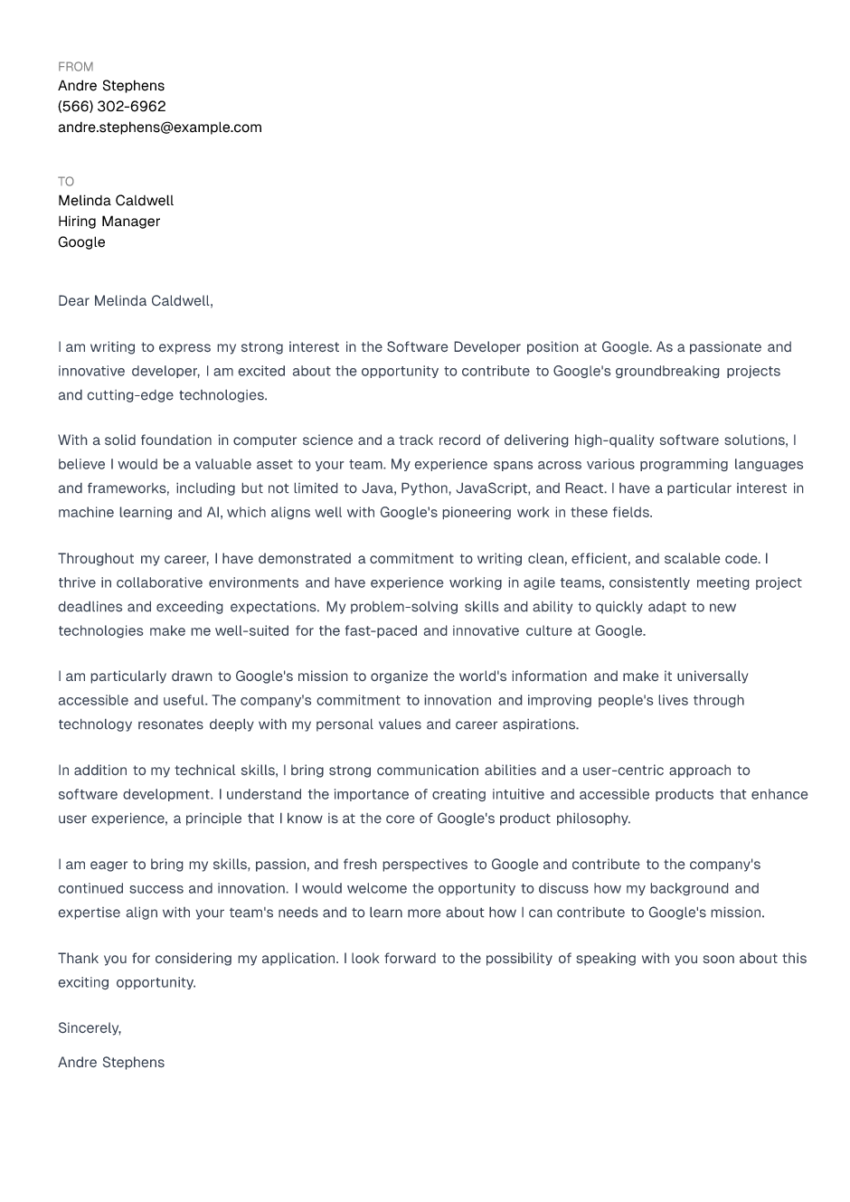 I am writing to express my strong interest in the Software Developer position at Google. As a passionate and innovative developer, I am excited about the opportunity to contribute to Google's groundbreaking projects and cutting-edge technologies.