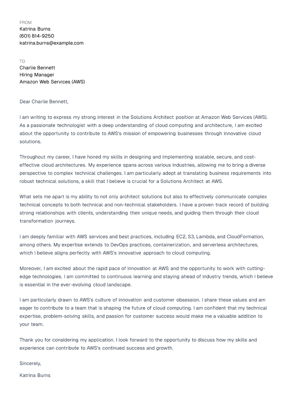 I am particularly drawn to AWS's culture of innovation and customer obsession. I share these values and am eager to contribute to a team that is shaping the future of cloud computing. I am confident that my technical expertise, problem-solving skills, and passion for customer success would make me a valuable addition to your team.
