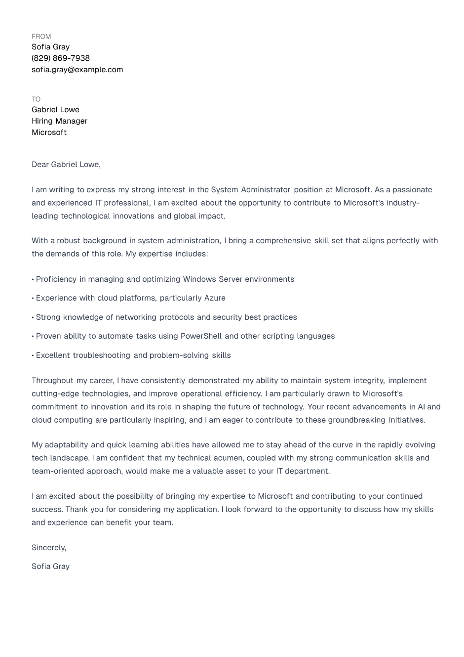 I am writing to express my strong interest in the System Administrator position at Microsoft. As a passionate and experienced IT professional, I am excited about the opportunity to contribute to Microsoft's industry-leading technological innovations and global impact.