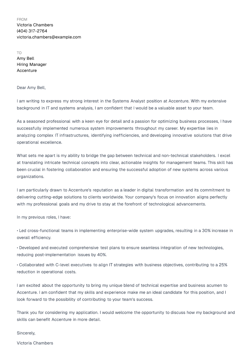 I am writing to express my strong interest in the Systems Analyst position at Accenture. With my extensive background in IT and systems analysis, I am confident that I would be a valuable asset to your team.