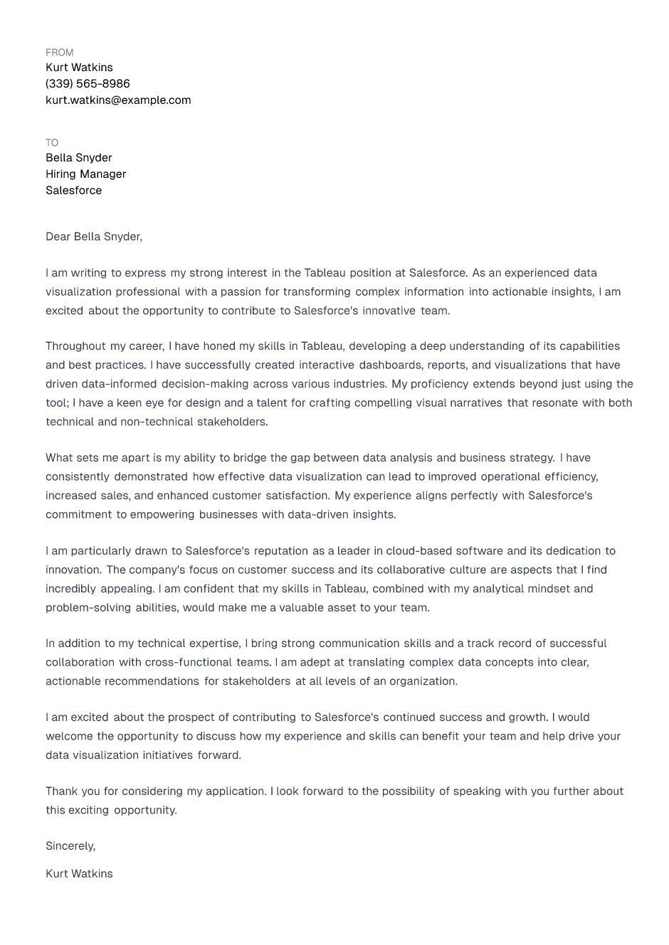 By paying attention to these details in your greeting, you'll set a positive tone for the rest of your Tableau cover letter and show the hiring manager that you're thorough and professional.