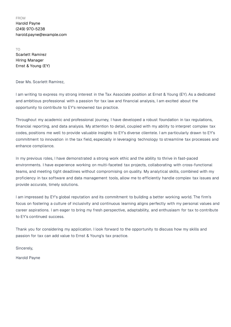 Thank you for considering my application. I look forward to the opportunity to discuss how my skills and passion for tax can add value to Ernst & Young's tax practice.