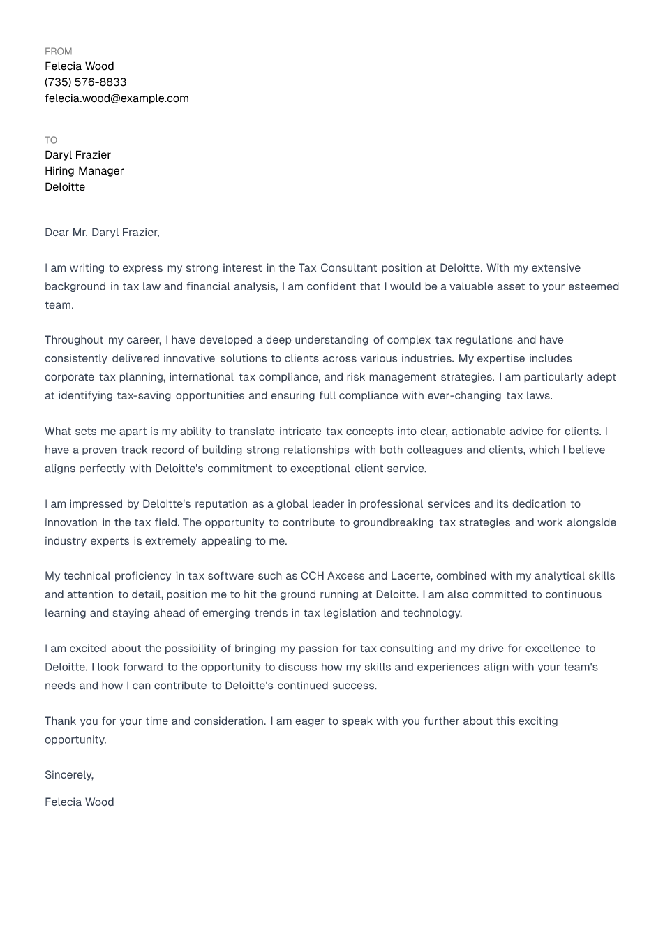 I am excited about the possibility of bringing my passion for tax consulting and my drive for excellence to Deloitte. I look forward to the opportunity to discuss how my skills and experiences align with your team's needs and how I can contribute to Deloitte's continued success.