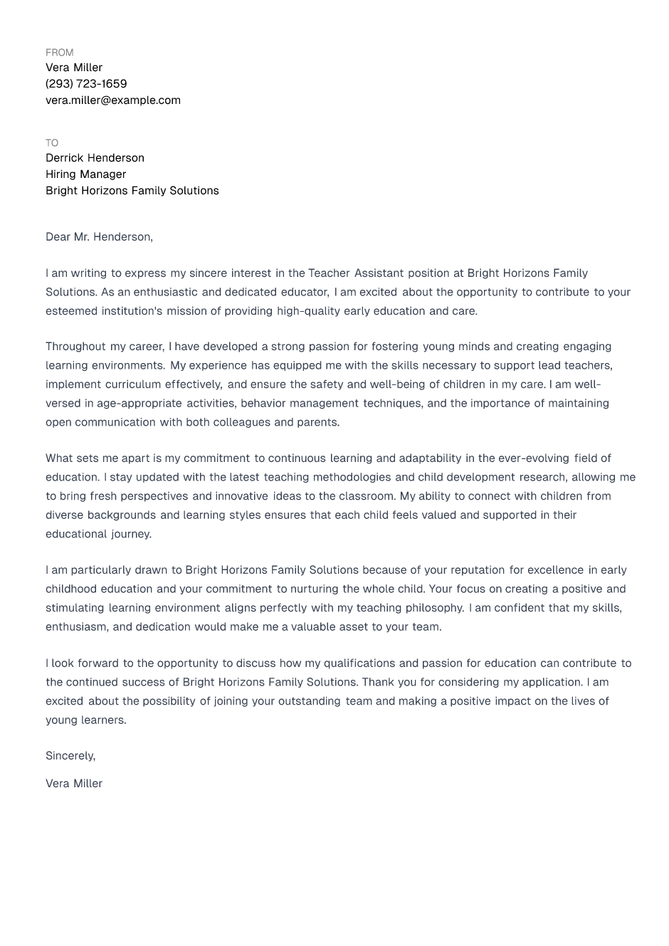 I am writing to express my sincere interest in the Teacher Assistant position at Bright Horizons Family Solutions. As an enthusiastic and dedicated educator, I am excited about the opportunity to contribute to your esteemed institution's mission of providing high-quality early education and care.