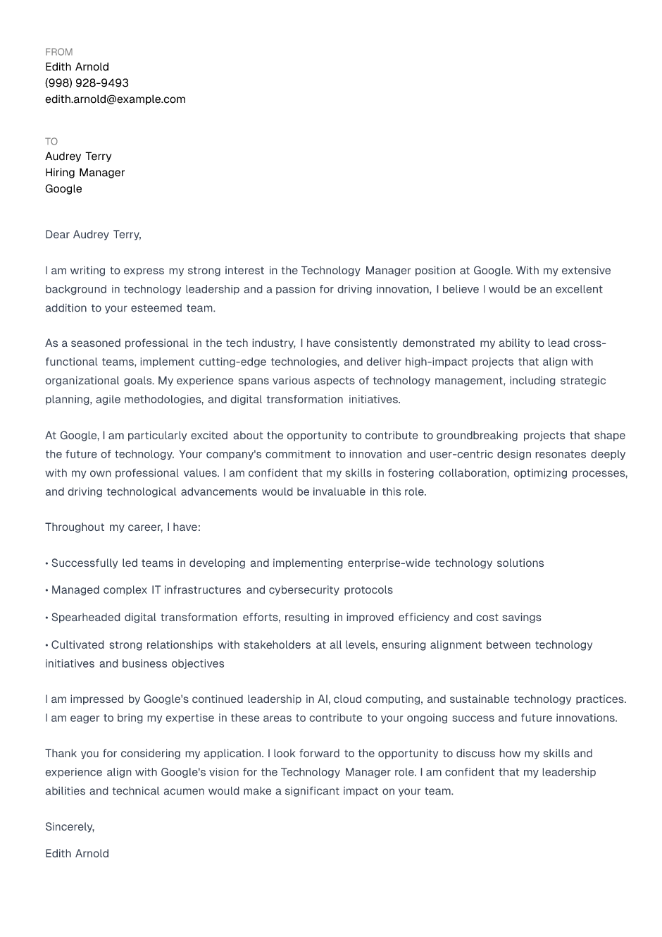 Technology Manager Cover Letter Example