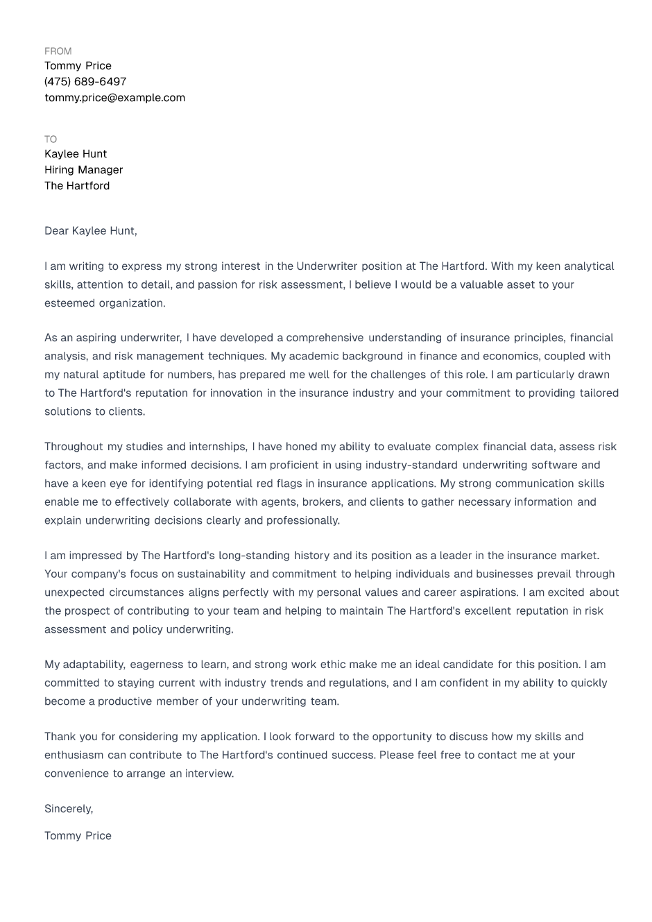 As an aspiring underwriter, I have developed a comprehensive understanding of insurance principles, financial analysis, and risk management techniques. My academic background in finance and economics, coupled with my natural aptitude for numbers, has prepared me well for the challenges of this role. I am particularly drawn to The Hartford's reputation for innovation in the insurance industry and your commitment to providing tailored solutions to clients.