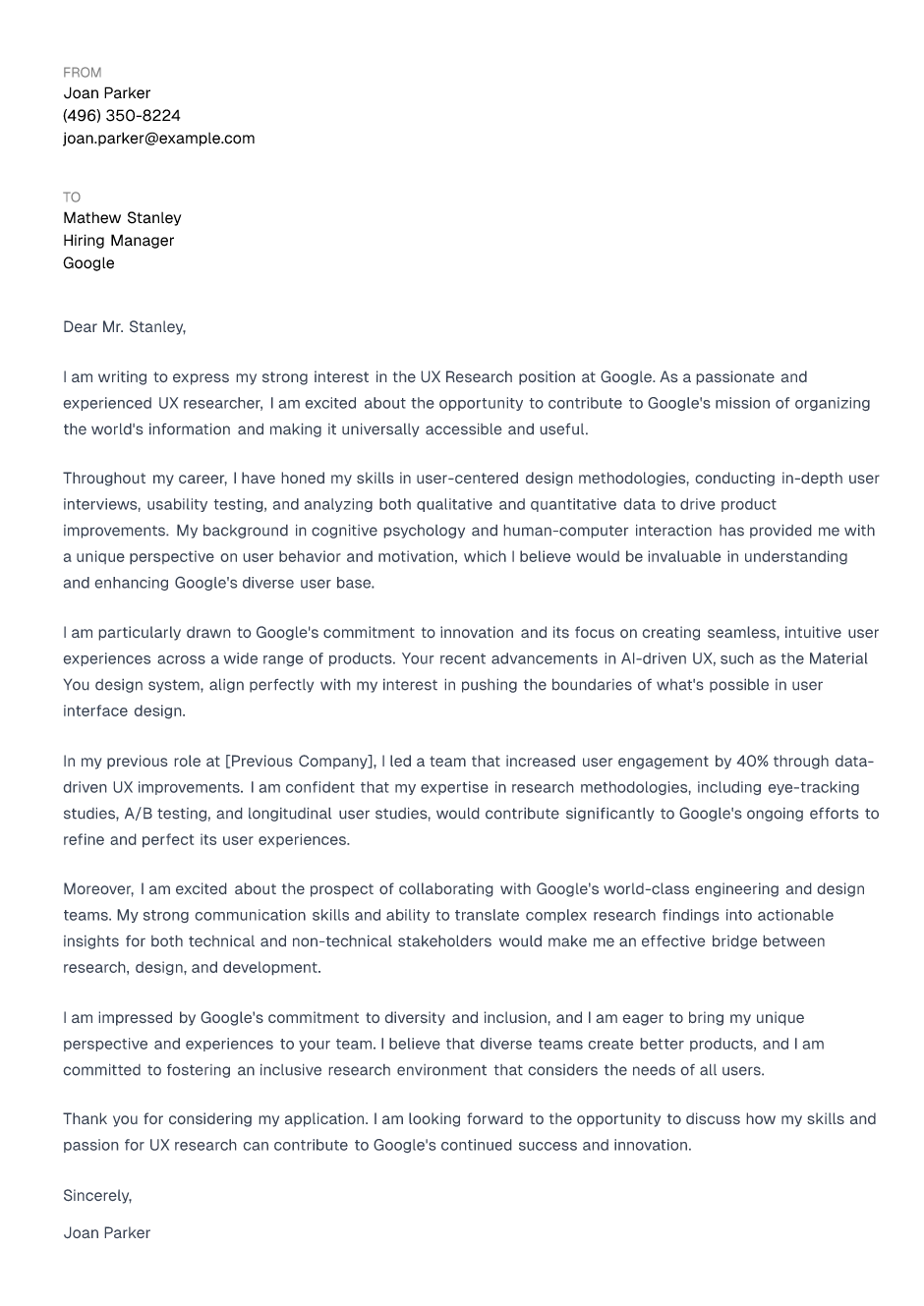 In my previous role at [Previous Company], I led a team that increased user engagement by 40% through data-driven UX improvements. I am confident that my expertise in research methodologies, including eye-tracking studies, A/B testing, and longitudinal user studies, would contribute significantly to Google's ongoing efforts to refine and perfect its user experiences.
