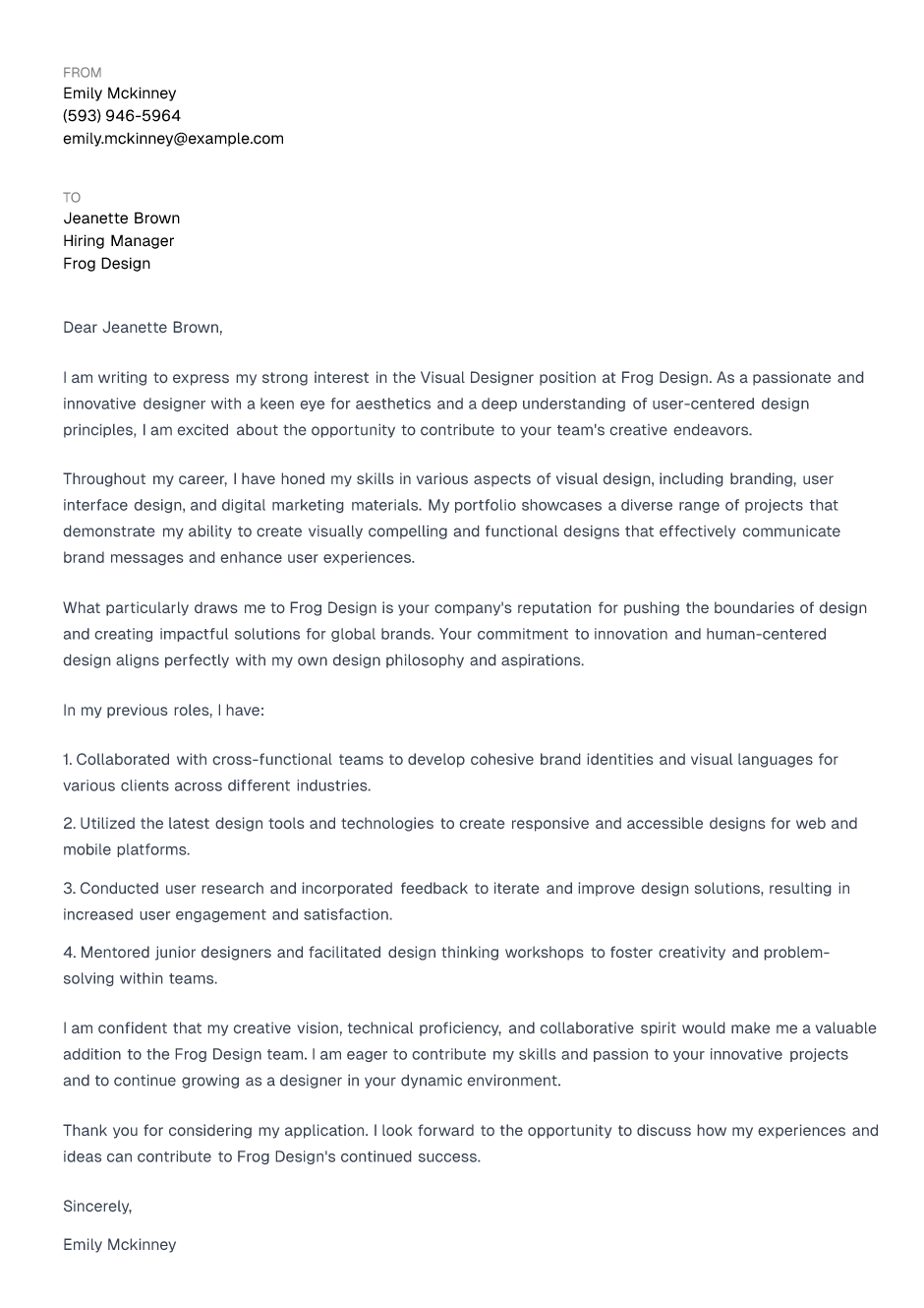 I am writing to express my strong interest in the Visual Designer position at Frog Design. As a passionate and innovative designer with a keen eye for aesthetics and a deep understanding of user-centered design principles, I am excited about the opportunity to contribute to your team's creative endeavors.