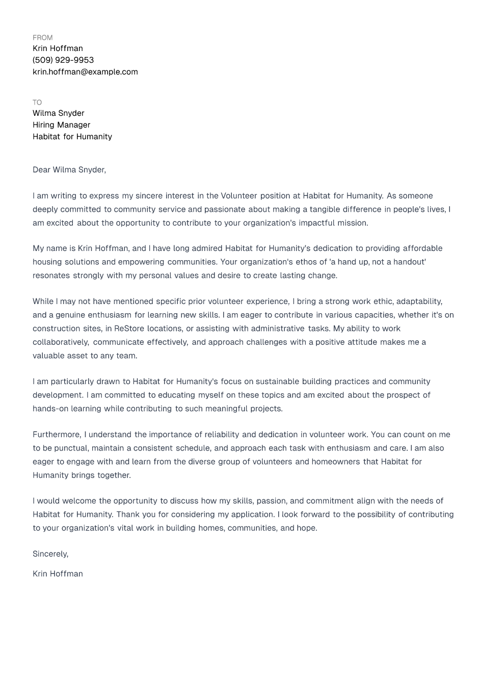 I am writing to express my sincere interest in the Volunteer position at Habitat for Humanity. As someone deeply committed to community service and passionate about making a tangible difference in people's lives, I am excited about the opportunity to contribute to your organization's impactful mission.