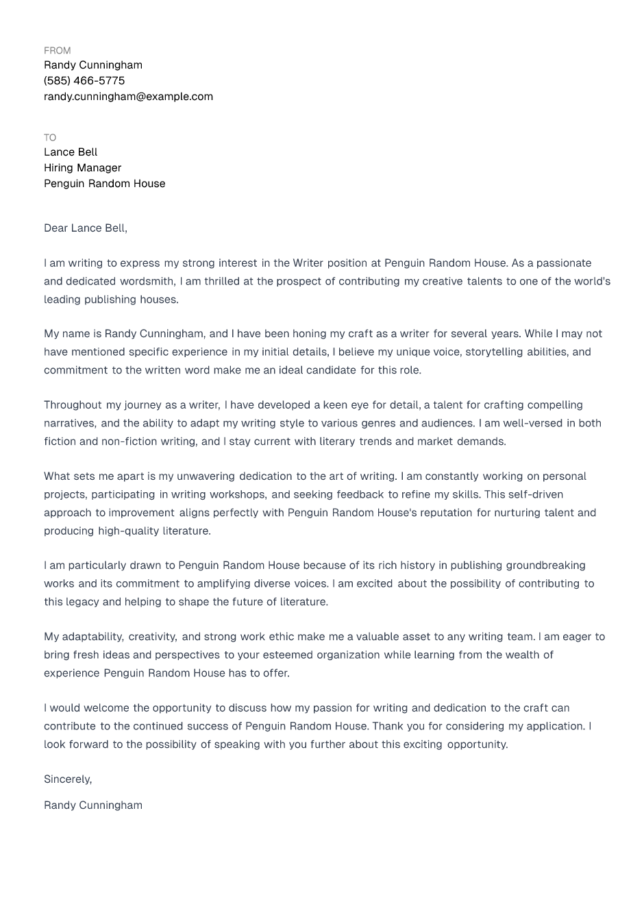 I would welcome the opportunity to discuss how my passion for writing and dedication to the craft can contribute to the continued success of Penguin Random House. Thank you for considering my application. I look forward to the possibility of speaking with you further about this exciting opportunity.